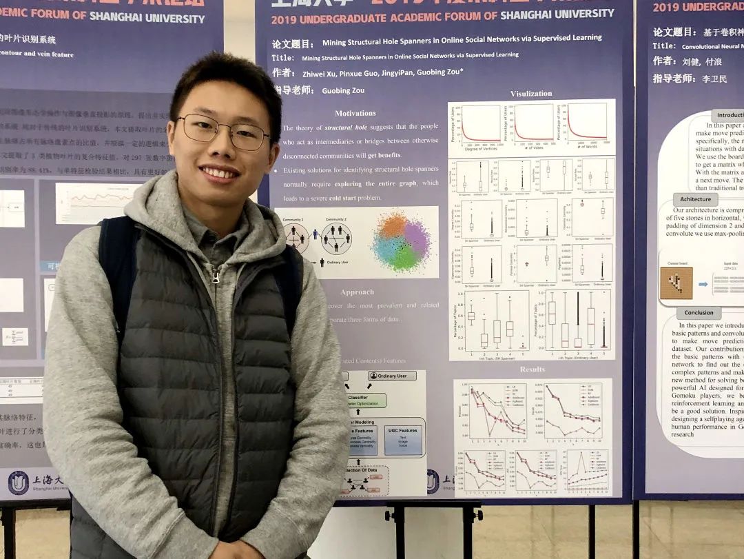 本科期间,他积极投身于学术科研工作。从在本科生学术论坛斩获二等奖开始,他就展现出了对科研的巨大兴趣。至今为止,他在CCF B类会议International Conference on Web Services和International Conference on Service-Oriented Computing各发表论文一篇(其中1篇为第一作者)。他以第二作者参与的在线社交网络研究的论文,被数据挖掘顶级期刊IEEE Transactions on Knowledge and Data Engineering录用。此外,他以第三作者参与的机器学习辅助心理诊疗的课题,也被SCI三区期刊Frontiers in Psychiatry全文收录。