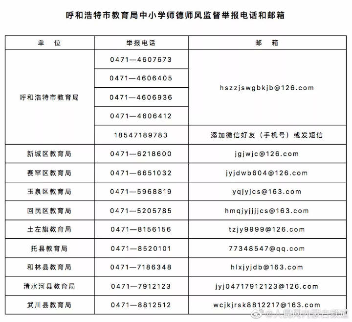 呼和浩特市教育局将以此为戒,举一反三,持续深化师德师风建设,在全市教育系统开展警示教育活动,不断强化监督检查和责任追究,对师德失范行为零容忍,发现一起,查处一起,绝不姑息。呼和浩特市教育局及各旗县区教育局向社会公布师德师风监督举报电话和电子邮箱,自觉接受学生、家长和社会的监督。请社会各界、广大师生、家长参与监督,共同营造首府风清气正的良好教育生态。