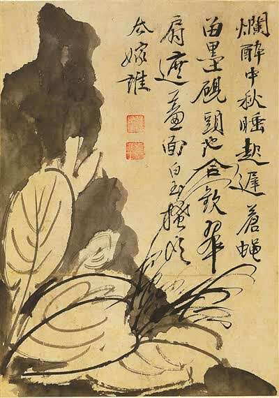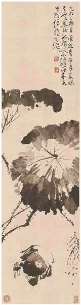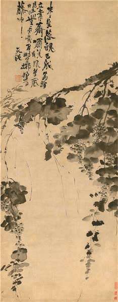 徐渭的画作常常以物喻人,借物抒怀。仅以葡萄、芭蕉、螃蟹和牡丹为例,这四样成了他最喜欢用来表达个人际遇的题材。北京故宫博物院收藏的那件最为有名的《墨葡萄图》上那首广为传诵的题画诗,早已成为徐渭抒发怀才不遇之感最为精炼的概括——“半生落魄已成翁,独立书斋啸晚风。笔底明珠无处卖,闲抛闲掷野藤中”。