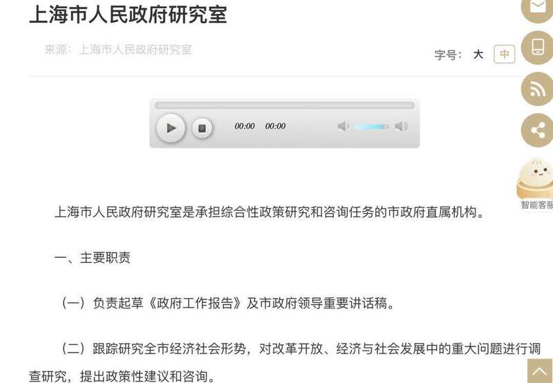 据上海市政府官网介绍,上海市人民政府研究室是承担综合性政策研究和咨询任务的市政府直属机构,主要职责包括负责起草《政府工作报告》及市政府领导重要讲话稿;跟踪研究全市经济社会形势,对改革开放、经济与社会发展中的重大问题进行调查研究,提出政策性建议和咨询;参与市政府有关重要文件起草工作;完成市委、市政府交办的其他任务。内设机构8个,即:秘书处、综合处、经济发展处、城市发展处、社会发展处、区域发展处、改革处、政务研究处。