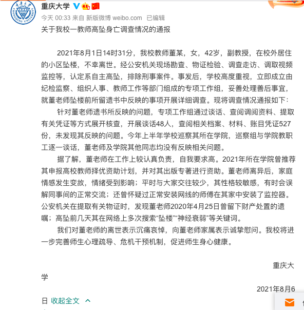8月1日14时31分,重庆大学马克思主义学院副教授董某在家中坠楼身亡。坠楼前,董某留下遗书,举报其同事存在乱用职权、贪污公款、监控他人私生活等违法违纪行为。