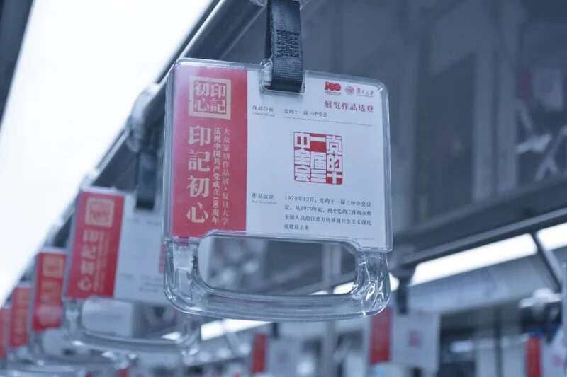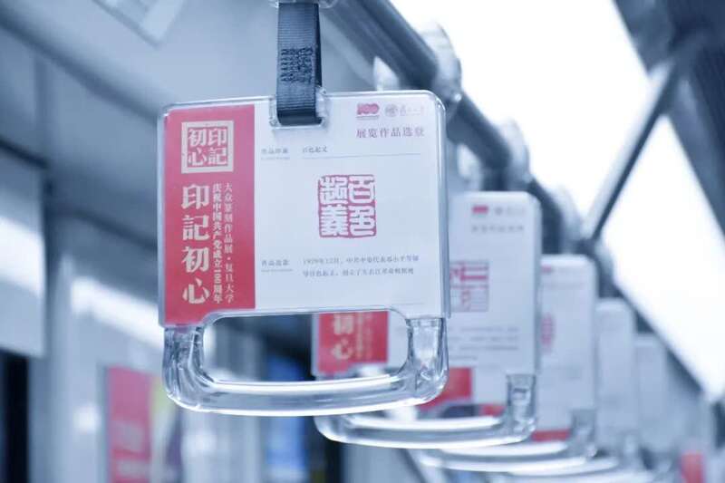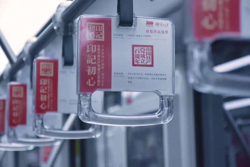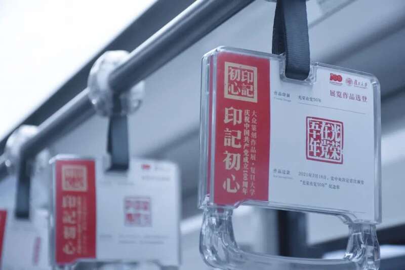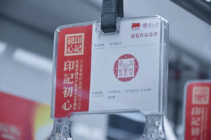 为隆重庆祝中国共产党成立100周年,深入开展党史学习教育,大力弘扬中华优秀传统文化,复旦大学与上海申通地铁集团联合推出为期1个月的“印记初心红色专列”主题活动,选登“印记初心大众篆刻作品展”的优秀作品,投放到2列地铁10号线列车上,以地铁拉手为载体,以篆刻印面为关键词,提纲挈领地讲述了党的百年历史,教育引导广大党员不忘初心牢记使命,坚定理想信念践行党的宗旨,团结带领人民群众为美好生活而努力、为民族复兴而奋斗。活动得到中国建设银行上海分行的大力支持。