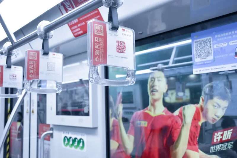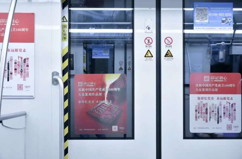 观众通过扫描地铁10号线列车车门和车壁上的线上展览二维码即可浏览展品的印章材质、印面介绍等详细内容。走出校园,篆刻这一新起的大众文化串联起百年变迁的红色资源,让市民群众在乘坐地铁的同时更加坚定中国道路自信和文化自信。