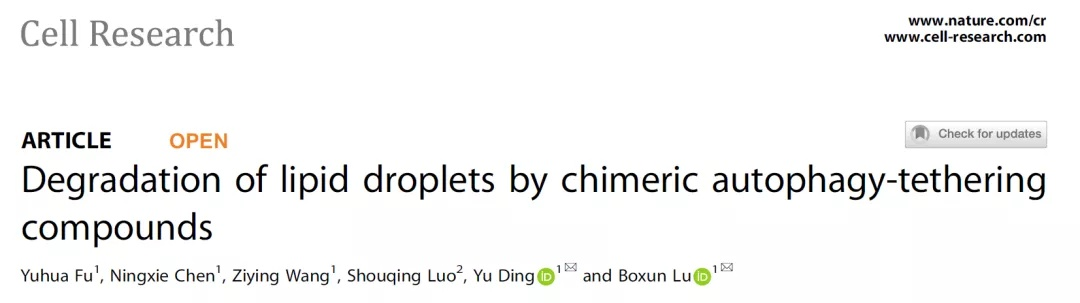 通过两年的努力,2021年7月8日,鲁伯埙/丁澦团队在《细胞研究》(Cell Research)杂志上发表了名为《利用组装型自噬绑定化合物(ATTEC)降解脂滴》(Degradation of lipid droplets by chimeric autophagy-tethering compounds)的文章,首次实现了非蛋白类生物大分子的靶向降解,从而实现了靶向降解技术从蛋白向非蛋白物质的突破,把制药靶点的范围扩大到了另一个世界,为新药研发开拓了一条可能的原创路径。