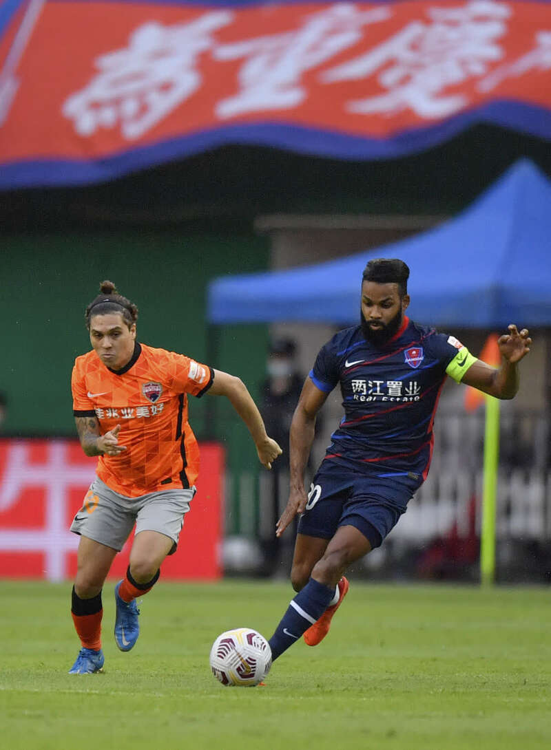 8月11日,深圳队球员金特罗(左)与重庆两江竞技队球员费尔南迪尼奥在比赛中拼抢。新华社记者孙凡越摄