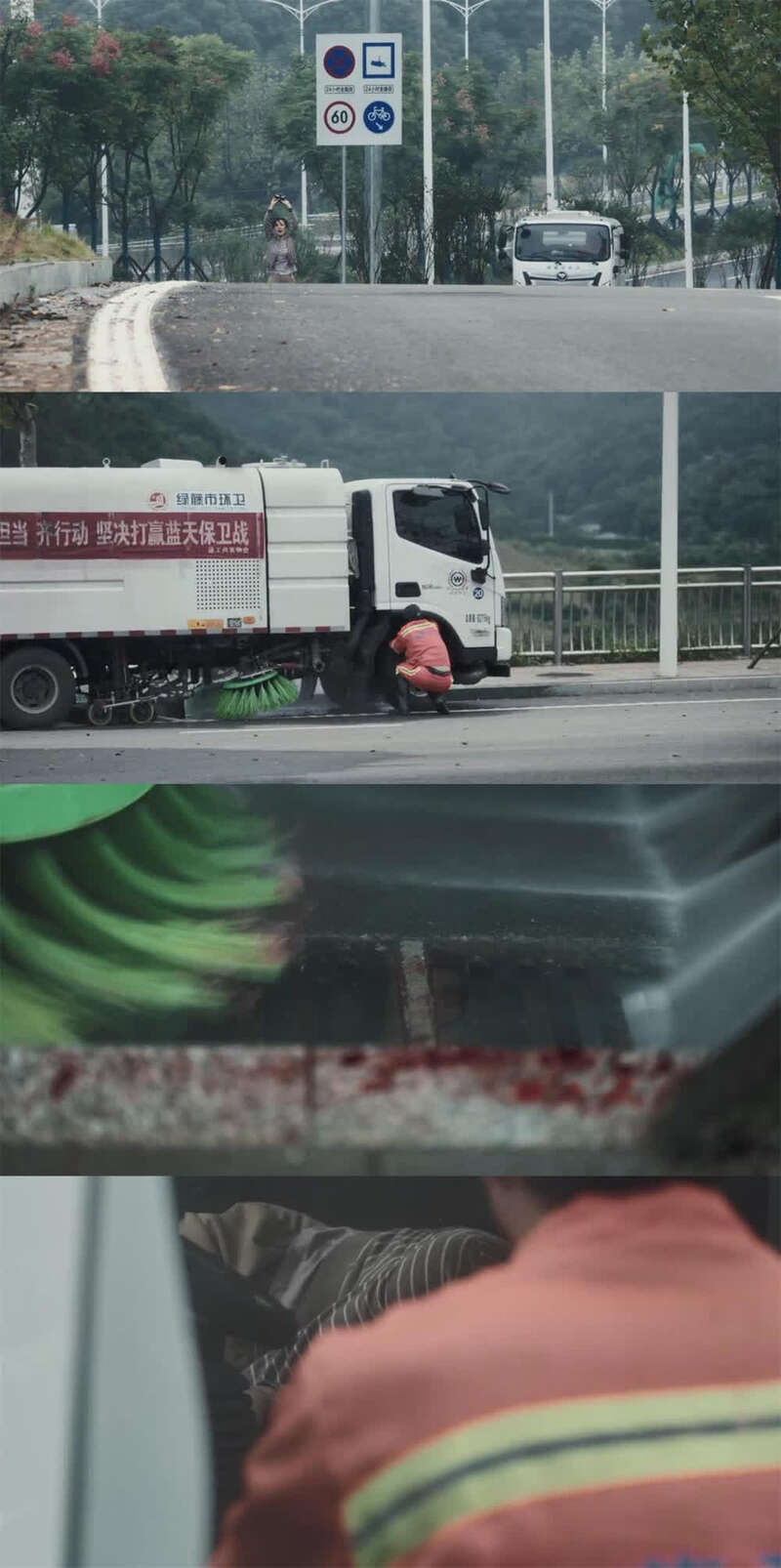 督导组的车从机场开往市区,路上被封路了,薛梅就抄小道到马路上,跪着鸣冤。这时,薛梅背后一辆响着音乐的垃圾车驶来。下一个镜头是远景,接着督导组的车开过,切换到垃圾车的中景,近景,之后是雨刷在高速运转的特写,雨刷下有一堆血迹流入下水道。司机打开车门,薛梅的尸体已经躺在里头了。