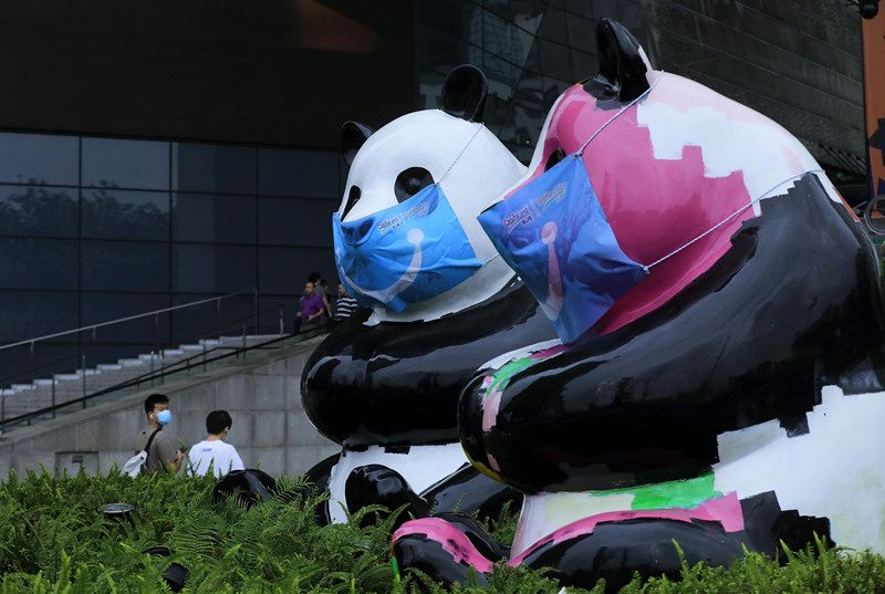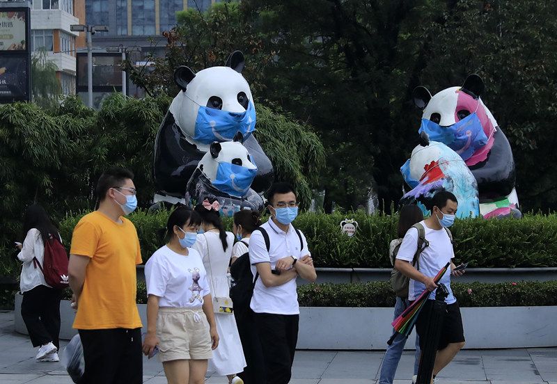 2021年8月12日,成都市人民南路一广场雕塑“熊猫一家”戴上了口罩,意在提醒市民在公共场合戴好口罩,做好个人防护。中新社记者 王磊 摄