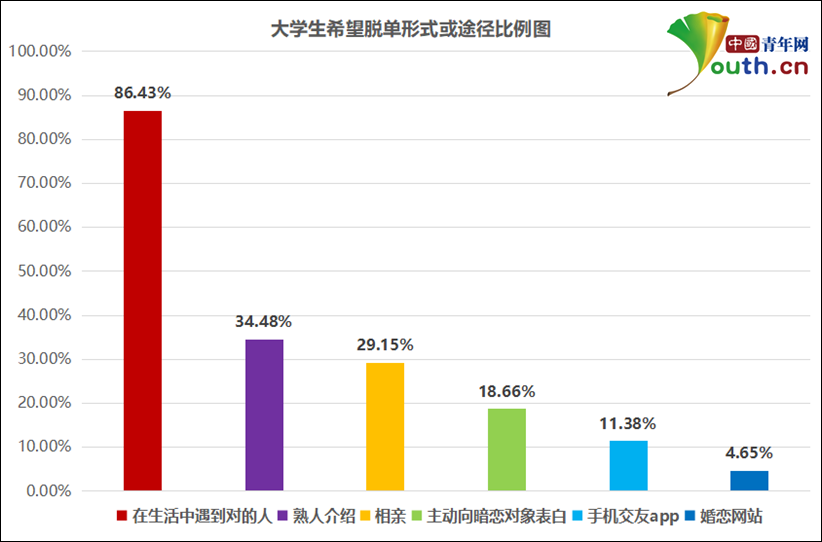 大学生希望脱单形式或途径比例图。中国青年网记者 李华锡 制图