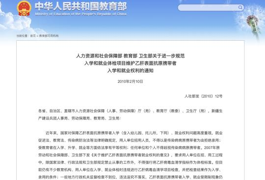 实际上,早在2010年,人力资源和社会保障部、教育部、原卫生部联合发布的相关文件中就明确要求,各级各类教育机构、用人单位在公民入学、就业体检中,不得要求开展乙肝项目检测,不得要求提供乙肝项目检测报告,也不得询问是否为乙肝表面抗原携带者。各级医疗卫生机构也不得在入学、就业体检中提供乙肝项目检测服务。