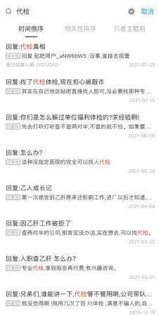 在百度贴吧“乙肝吧”,不时会有用户发布网帖咨询如何找代检。今年6月,一位网友就因担心遭到同事歧视,寻求如何“躲过”单位的福利体检,有人支招可以找代检;7月,另一位网友发帖称,一家名为“启航体检”的“枪手”帮他做了代检,但是做完之后还在问他要钱,他怀疑遇到了敲诈。