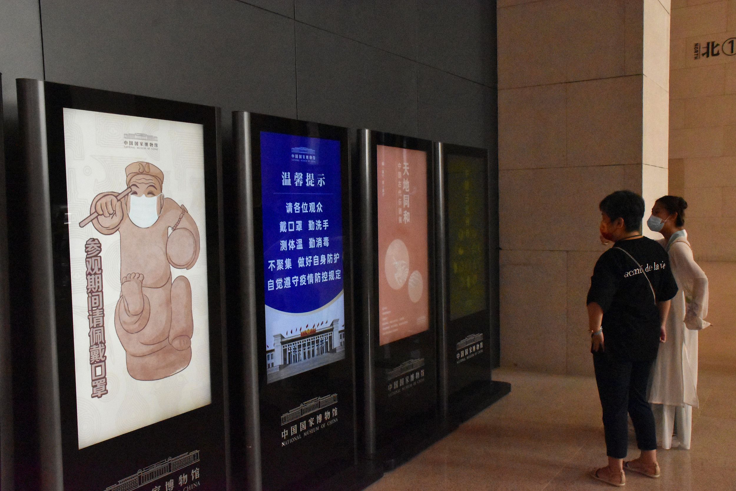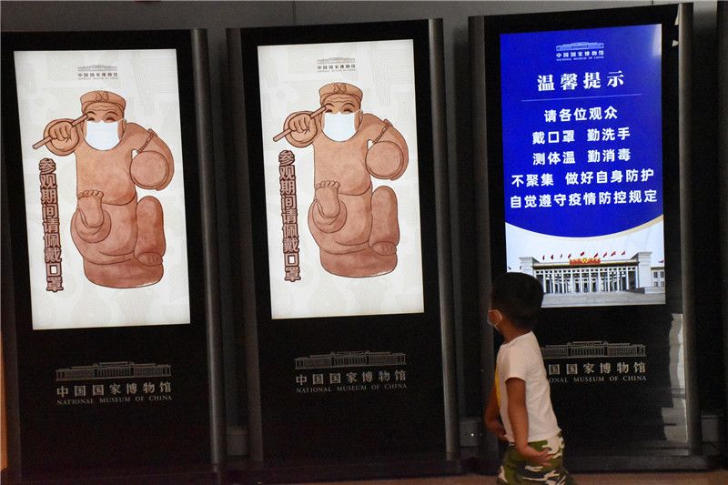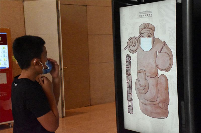 2021年8月14日,北京,中国国家博物馆防疫宣传中利用馆藏文物东汉击鼓说唱陶俑“戴口罩”的方式,提醒游客注意防护规范。