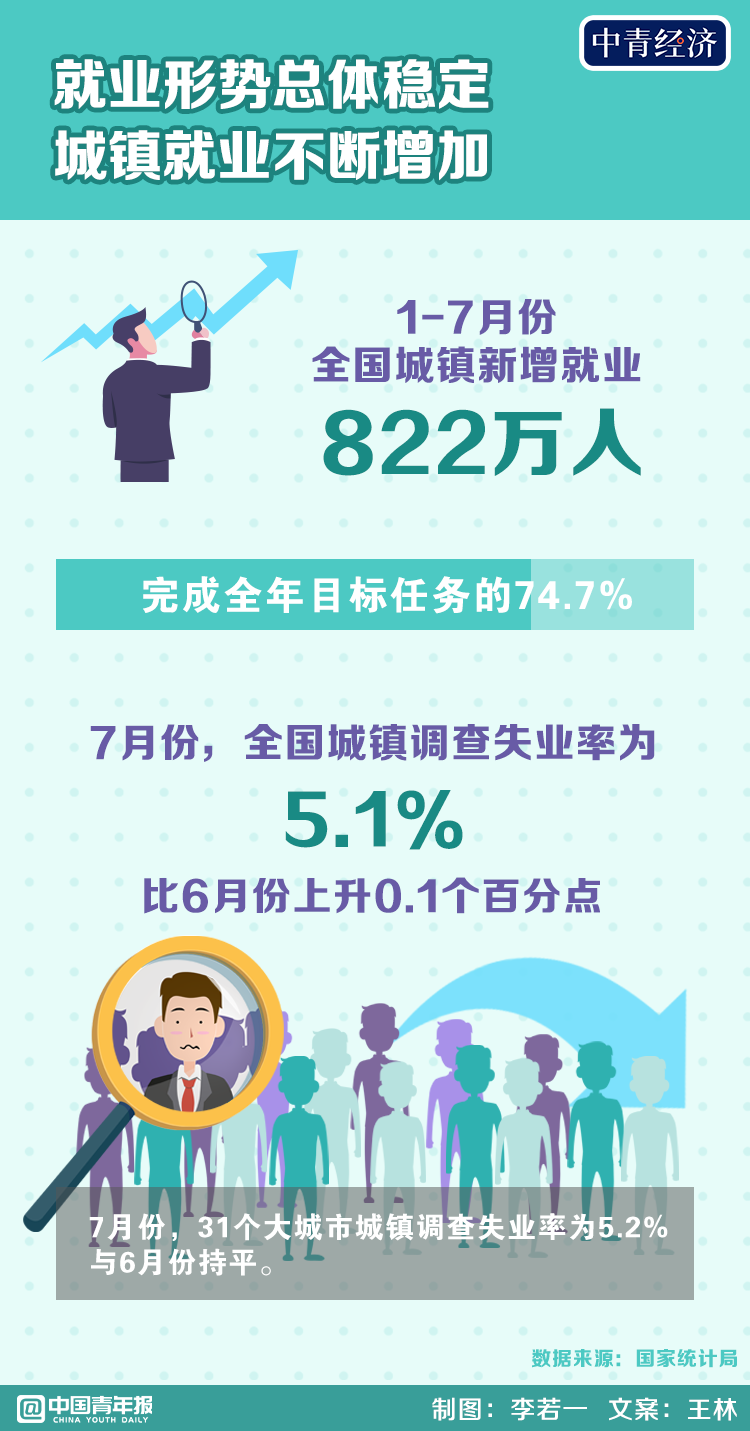 中国青年报客户端北京8月16日电(中青报·中青网记者王林 李若一)国家统计局今天发布的数据显示,1-7月份,全国城镇新增就业822万人,完成全年目标的74.7%,就业形势总体稳定,城镇就业不断增加。