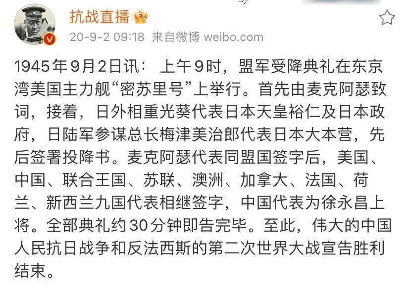 后来,@抗战直播 真的在2020年9月18日,开始了第二轮“直播”!近一年过去,发布微博总数已超4万条。
