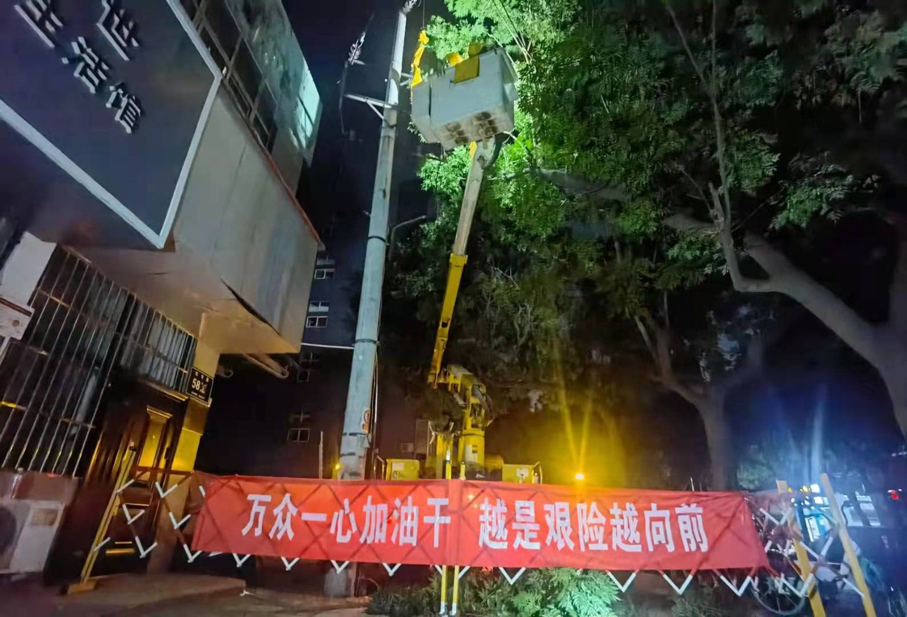 尽管有绝缘斗臂车在前方开路,但涌动漫灌的积水迟滞着队伍的前行,所过之处,皆为汪洋。
