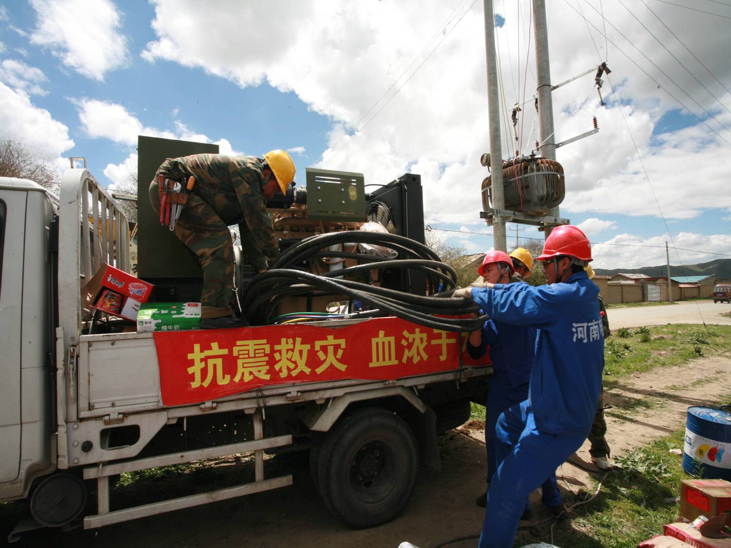 前后两批投入救援的共12名“雷锋号”队员立刻各司其职,展放电缆、接线、调试设备……