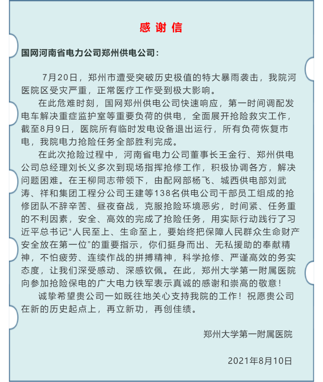 电不通,人不退。此后几天,河医院区供电抢修一直在持续,至7月24日,医院基本恢复供电,开始接诊。至8月9日22时,在国网郑州供电公司452名抢修人员的努力下,河医院区恢复所有负荷正常供电。