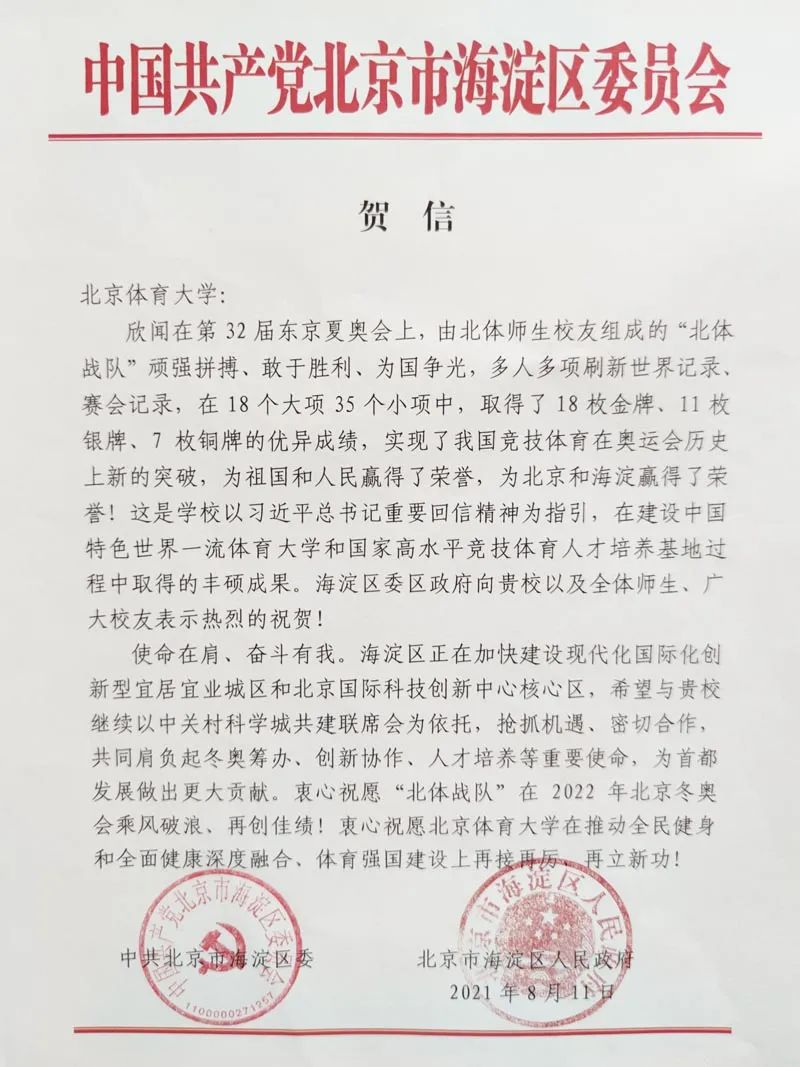 于军高度肯定了北体大为国家体育事业和地区高质量发展、弘扬奥运精神和中华民族文化、疫情防控等方面作出的贡献,对学校服务保障东京奥运会取得优异成绩表示祝贺和慰问,并代表海淀区委区政府送来贺信。