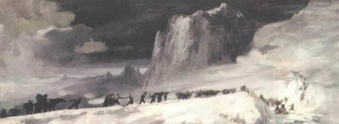 这幅作品以油画的形式,结合了中国山水画的三远法,用大刀阔斧、一气呵成的笔触,描绘了红军在高耸入云、风雪肆虐、冰坡险峻的夹金山中艰难行军的全景画面。