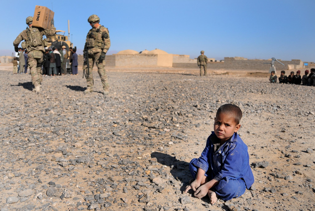 ▲2013年2月,阿富汗法拉赫省一名小男孩在尘土中玩耍,他身边就是荷枪实弹的美国大兵。