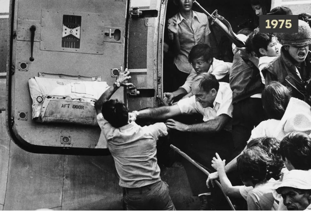▲1975年,“西贡铁拳”:一名南越人竭尽全力试图登上直升机,舱门口的美国使馆工作人员一拳把他打了下去。