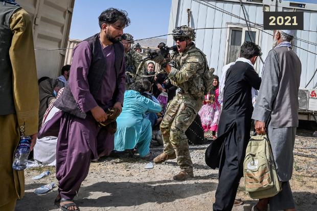 ▲2021年,“从实力地位出发”:在喀布尔卡尔扎伊国际机场,一名美军士兵咆哮着端起枪指向手无寸铁的阿富汗民众。