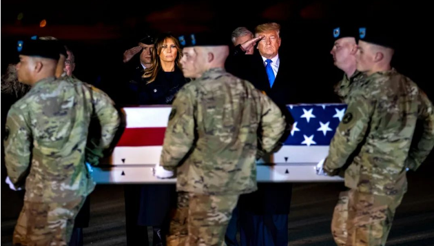 ▲2019年11月,时任美国总统特朗普和第一夫人梅拉尼娅在特拉华州的多佛空军基地迎接美军遗体。