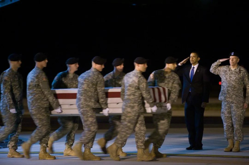 ▲2009年,时任美国总统奥巴马访问特拉华州的多佛空军基地,见证了18名在阿富汗丧生的美军士兵遗体“魂归故里”。