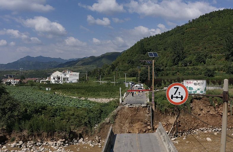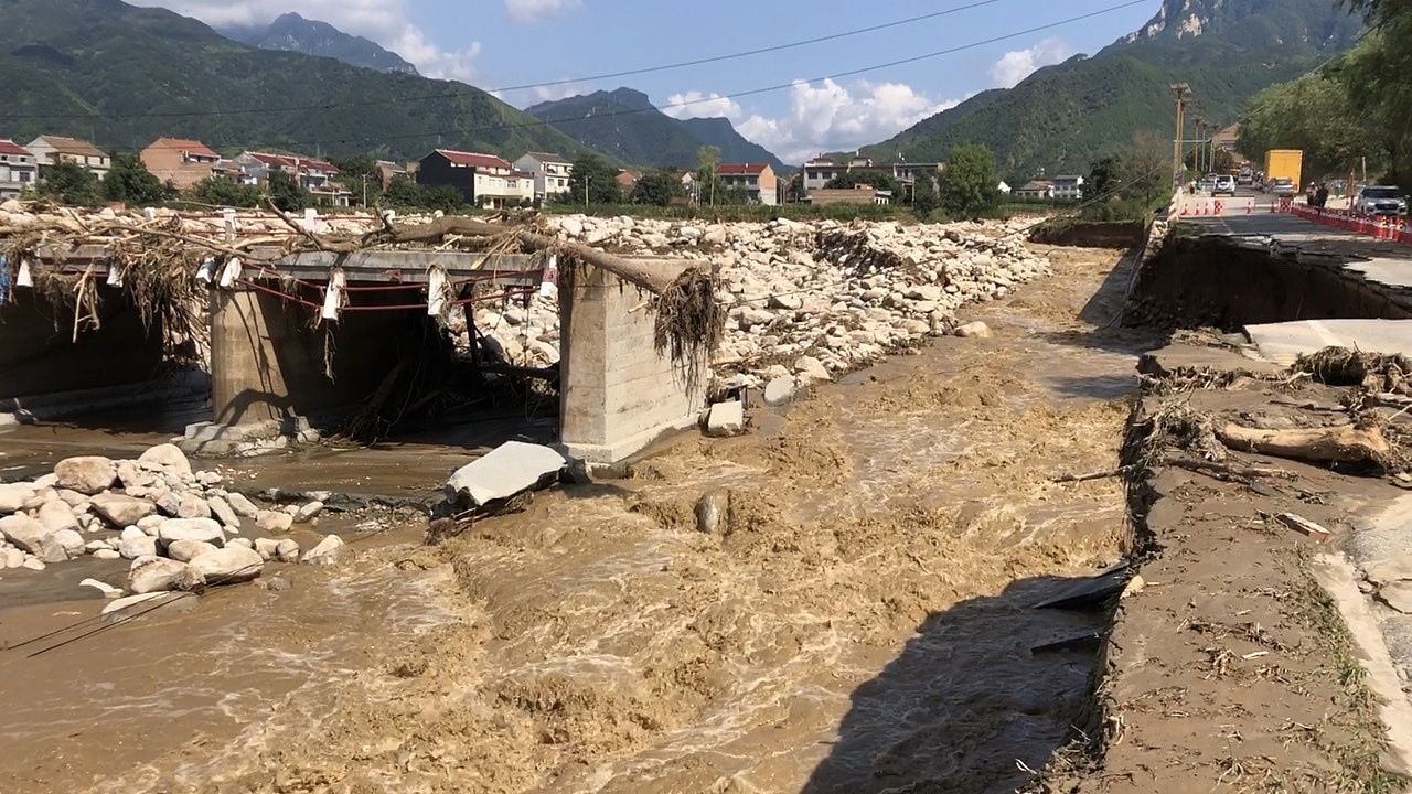 2021年8月20日,陕西西安蓝田县,蓝田九灞路上的大桥被洪水冲毁。