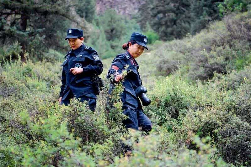 ▲ 8月11日,在甘肃祁连山国家级自然保护区内,生态管护员白拥梅(右)和同事巡护林区 范培珅摄/本刊