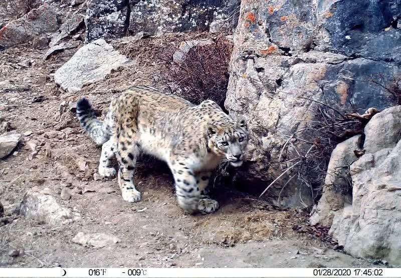 ▲ 布设在甘肃祁连山国家级自然保护区内的红外相机于2020年1月28日拍摄的雪豹活动影像 大熊猫祁连山国家公园甘肃省管理局张掖分局供图
