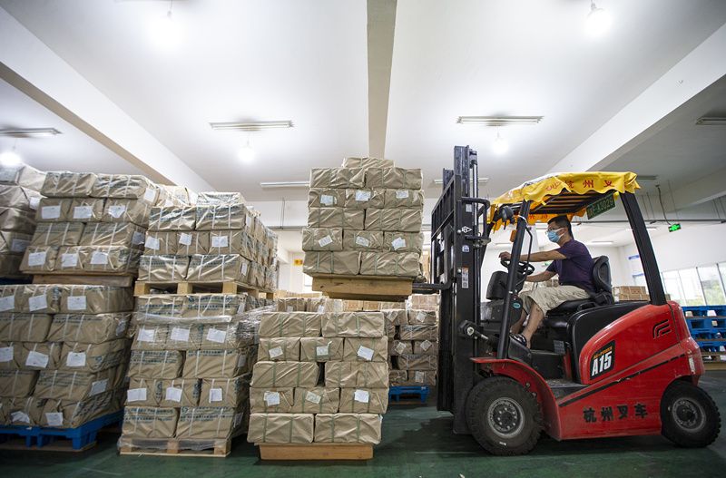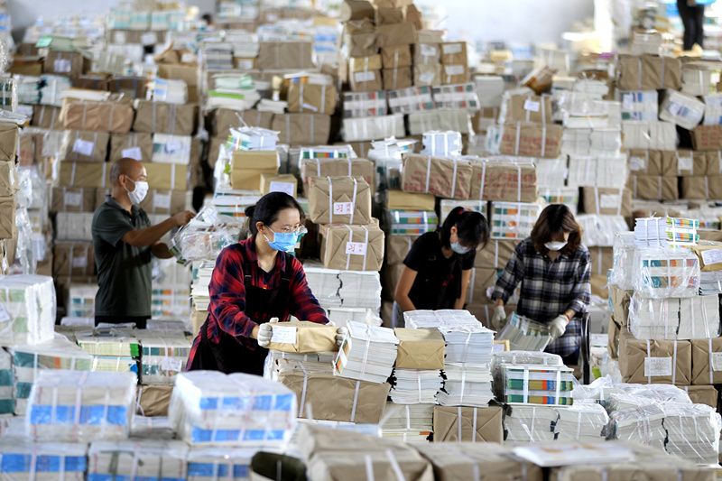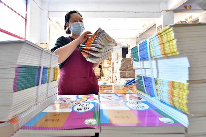 2021年8月20日,江苏南通海安,新华书店的工作人员在整理搬运教材。