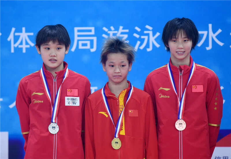 2020年10月4日,冠军广东海印队选手全红婵(中)、亚军北京水立方队选手张家齐(左)和季军上海浩沙队选手陈芋汐在颁奖仪式上。当日,在河北奥体中心举行的2020年全国跳水冠军赛暨东京奥运会、世界杯预选赛女子10米跳台决赛中,全红婵夺得冠军。新华社记者 王晓 摄