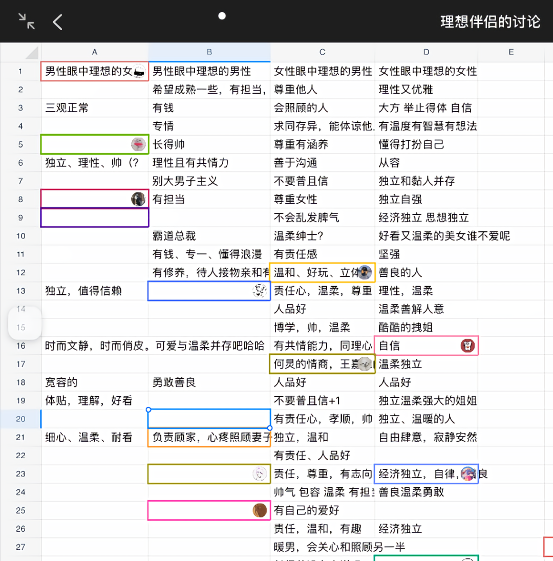 除了老师们的讲授,课堂还包含了丰富的音乐、视频、冥想、心理测试、小组讨论、书籍推荐和绘画练习等,无不让同学们更多合作参与到趣味盎然的活动中去。像画“生命树”这样的练习,是成长课区别于其他所有通识课最突出的亮点之一,给同学们带来了全新的上课体验。在学习家庭与三元关系时,同学们各自绘制了理想中的家庭三角,并积极分享、参与线上小调查;在探讨个体与集体时,每个小组各自用彩笔画出大家希望的人际关系;讲到自我实现时,大家填写了自己的价值观表格,并在组内讨论自己的行动障碍与应对策略;在恋爱的主题中,李娟、邵瑾老师甚至编写了一本《恋爱秘笈》送给大家,干货满满。