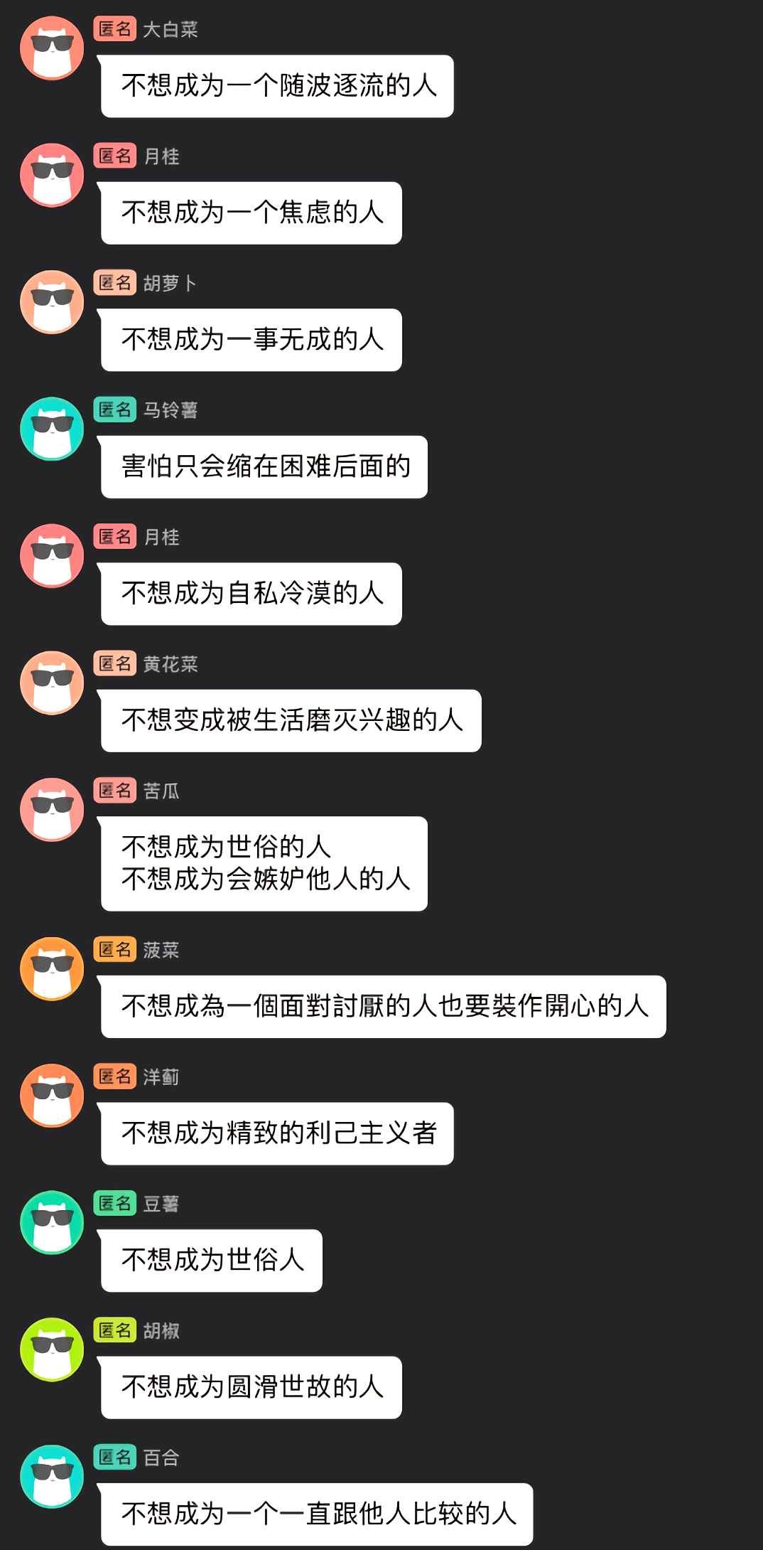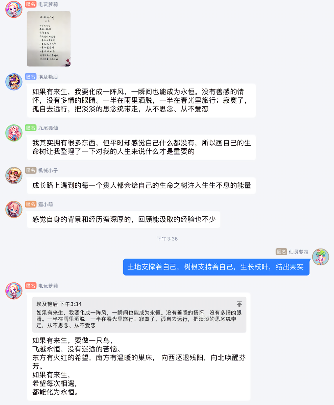 同学们尤为喜爱的还有成长课的“匿名环节”。“老师在课程上选用反映共性议题的改编案例,更容易引发共鸣,同学们也就能在匿名群中积极讲出自己的故事或者想法。”李娟老师一直结合群聊匿名功能和同学们讨论,让同学们能够更加自由而坦率地参与到课堂中,畅所欲言。通过互相分享和匿名讨论,同学们了解了彼此的不同看法,课堂中也弥漫着快活的气息,欢声笑语从不缺席。