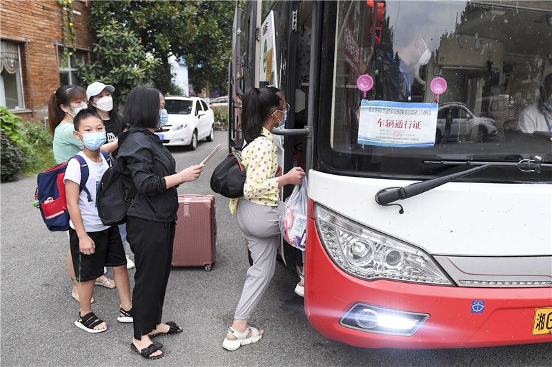 2021年8月23日,湖南张家界,家长与孩子登上大巴车。中新社记者 杨华峰 摄