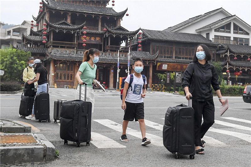 2021年8月23日,湖南张家界,家长带着孩子来到集合点。中新社记者 杨华峰 摄