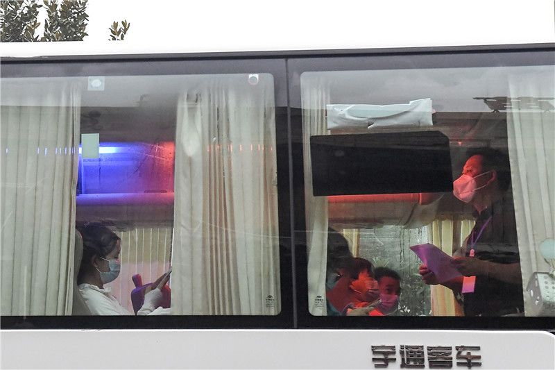 2021年8月23日,湖南张家界,工作人员在大巴车上清点人数。中新社记者 杨华峰 摄