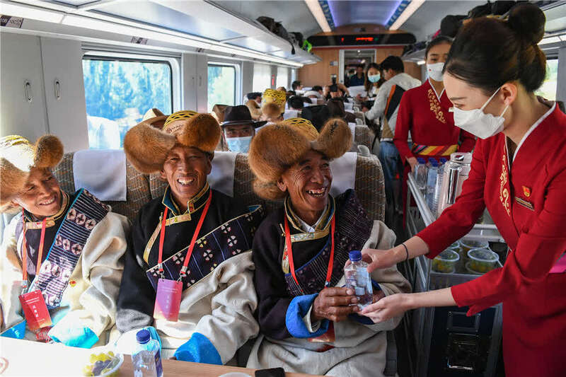 6月25日,全长435公里、设计时速160公里的拉林铁路建成通车,西藏首条电气化铁路建成,同时复兴号实现对31个省区市全覆盖。这是列车员向乘坐首趟复兴号高原内电双源动车组的乘客递水(6月25日摄)。新华社记者 普布扎西 摄