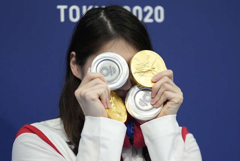 8月1日,在东京奥运会游泳赛程全部结束后,中国选手张雨霏在赛场拍照留念展示4块奖牌。 中新社记者 杜洋 摄