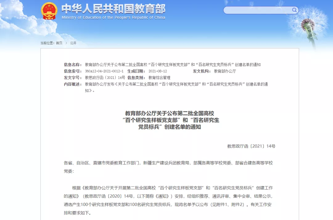 近年来,学校党委全面贯彻落实新时代党的建设总要求,着力加强研究生党员骨干队伍建设,启动实施“红旌工程”,引领广大研究生党员在当好党的创新理论传播者、科研报国主力军、服务社会带头人、青年学生领头雁等方面开展学思践悟。接下来,学校党委将按照教育部要求,进一步强化组织领导,注重发挥先进典型的引领示范、辐射带动作用,助推我校研究生党建工作质量全面创优全面提升。