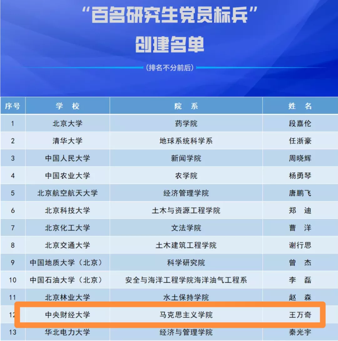 王万奇,男,中央财经大学马克思主义学院2018级博士研究生,2011年4月加入中国共产党。现为全国志愿服务青年讲师团讲师、中国青年志愿者协会会员,曾担任学院博士研究生党支部副书记、北京高校博士生理论宣讲团讲师。曾获得博士研究生国家奖学金、全国最美志愿者、全国抗震救灾优秀学生、全国优秀共青团员、中国青年志愿者优秀个人、中国大学生自强之星、中国大学生年度人物(入围奖)等多项荣誉。