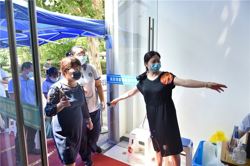 2021年8月25日,在南京市田家炳高级中学,志愿者老师在维持秩序。