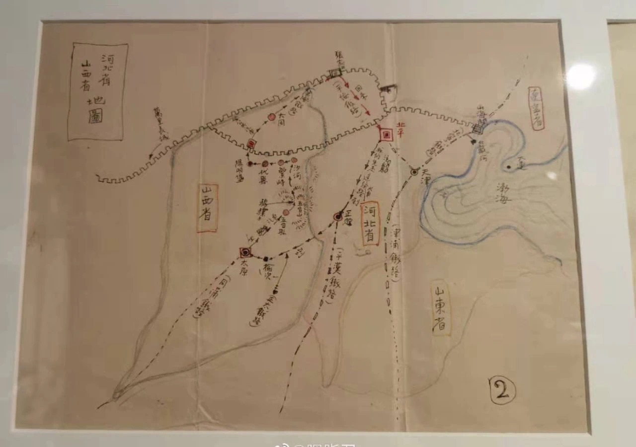 这封信中不但有温柔细腻的文字,还有严谨周密的绘图。林徽因在向女儿解释自己的行动路线时,还特意绘制了地图:“我同爹就慌慌张张绕到大同由平绥路回北平。现在我画张地图你看看,你就可以明白了。请看第二版第三版”。附录里的地图绘制得十分详尽,不同的地形和地标都用不同的图例和颜色标出,丝毫没有敷衍搪塞的意思。