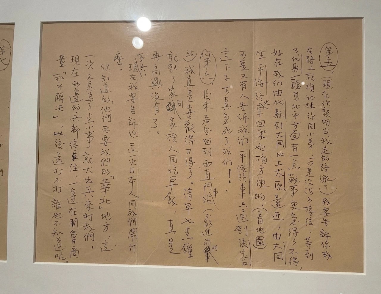 信中除了母爱的暗暗表露,还有家国大爱的坚毅。她在“第七”中说到:“我们希望不打仗事情就可以完;但是如果日本人要来占北平,我们都愿意打仗,那时候你就跟着大姑姑那边,我们就守在北平,等到打胜了仗再说。我觉得现在我们做中国人应该要顶勇敢,什么都不怕,什么都顶有决心才好。”