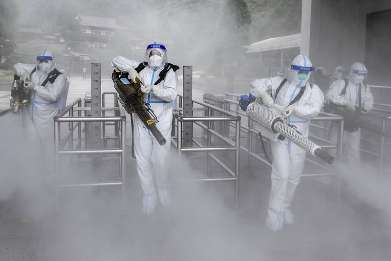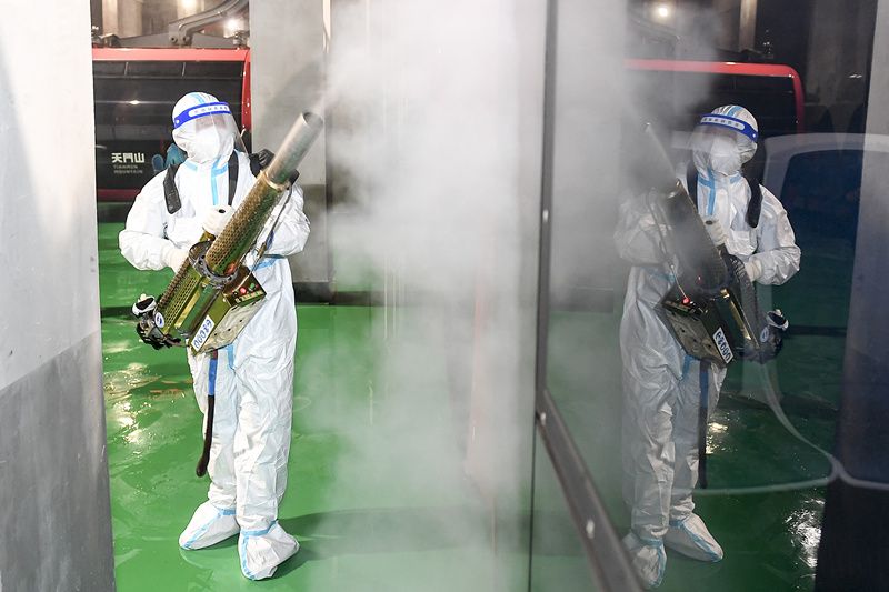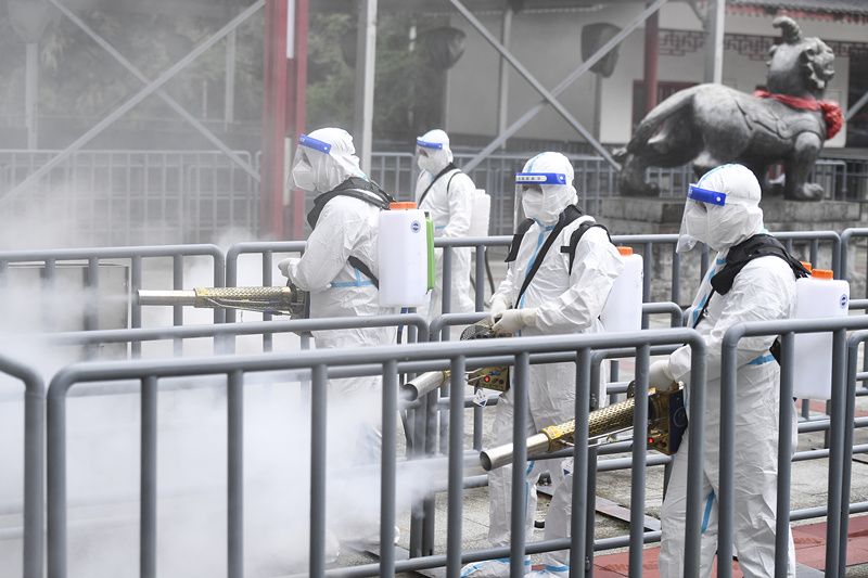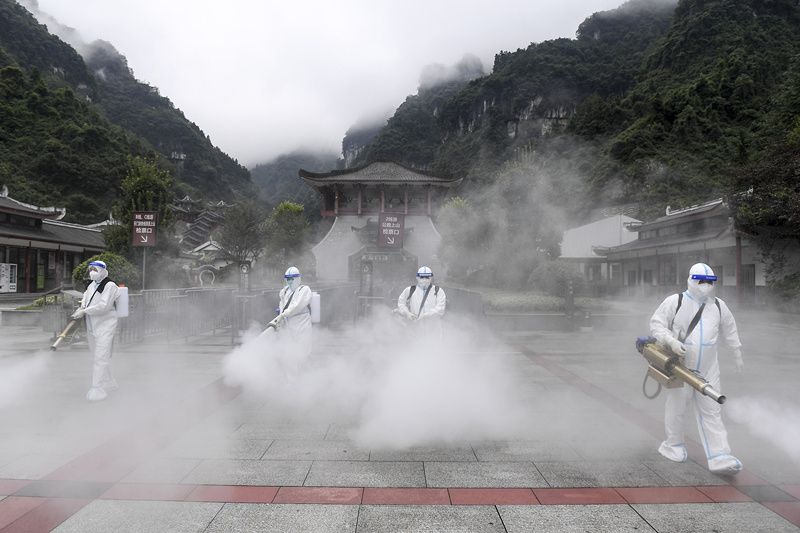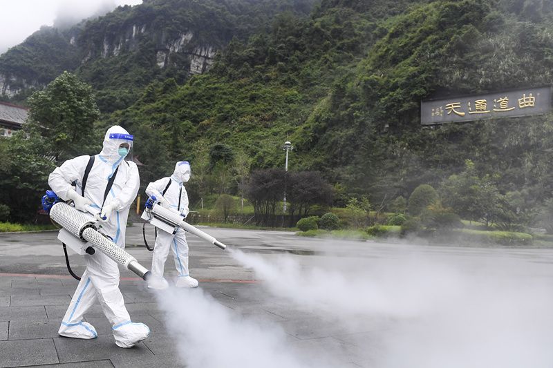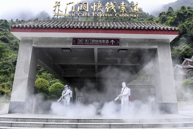 2021年8月26日,湖南张家界,蓝天救援队队员们对游客排队通道进行消杀。中新社记者 杨华峰 摄