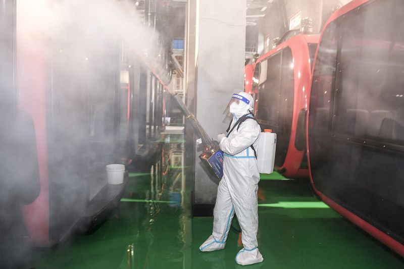 2021年8月26日,湖南张家界,蓝天救援队队员对景区内的缆车进行消杀。中新社记者 杨华峰 摄