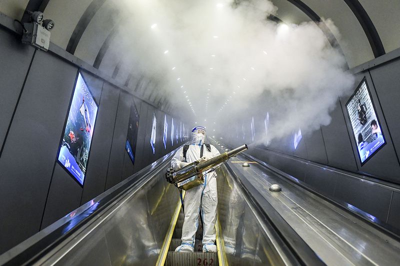 2021年8月26日,湖南张家界,蓝天救援队队员手持消杀工具对穿山扶梯进行消毒。中新社记者 杨华峰 摄