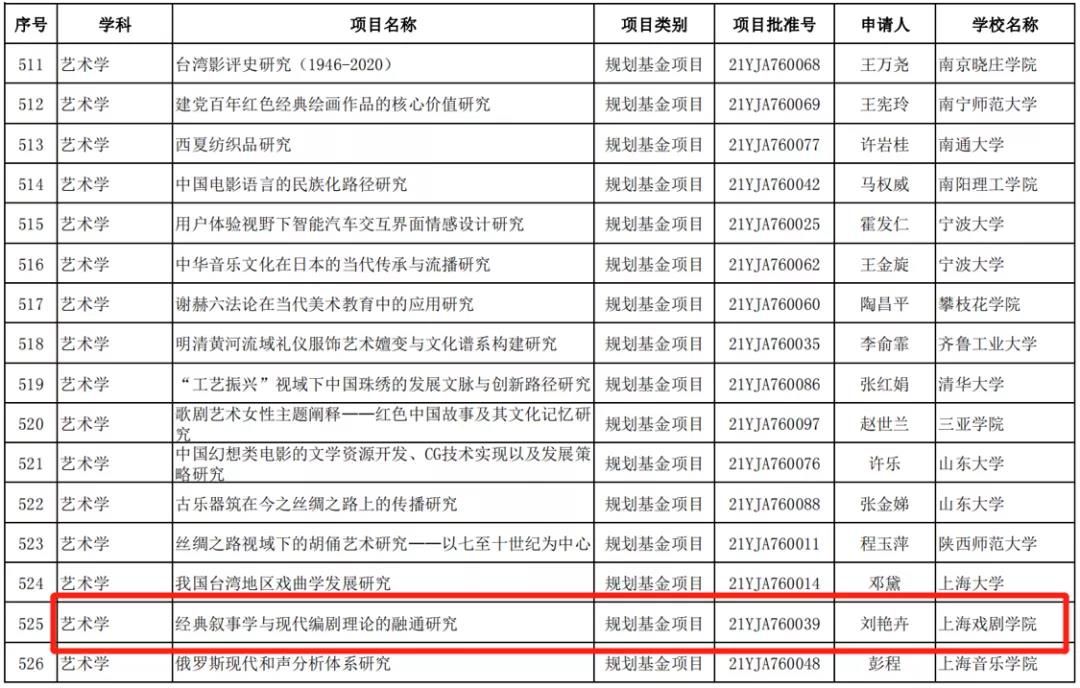 刘艳卉立项的课题是《经典叙事学与现代编剧理论的融通研究》(规划基金项目),将尝试运用叙事学理论观照、阐释现代编剧理论的相关概念,打通叙事学与编剧学之间的关联,提供戏剧创作的新思路新方法,促进编剧理论的系统化与科学化,建立符合实践需求、具有前瞻性和前沿性的编剧叙事体系。