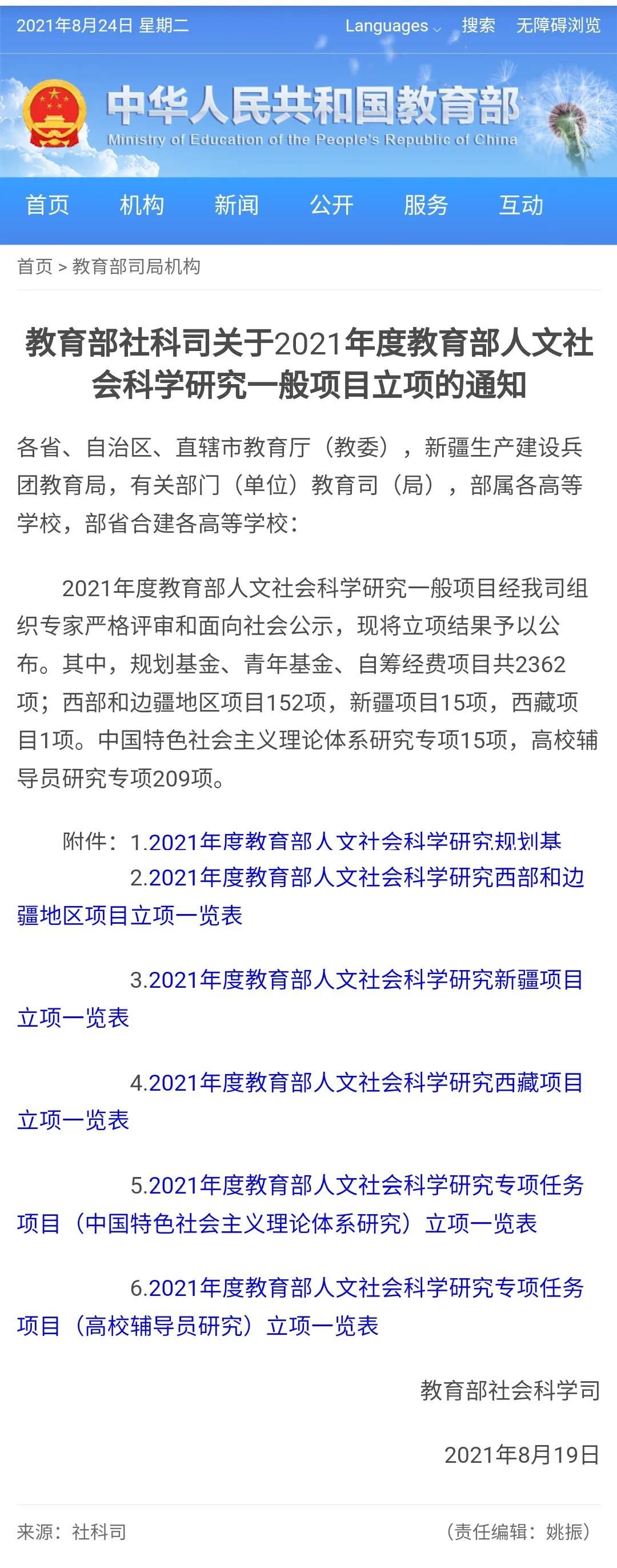 近日,《教育部社科司关于2021年度教育部人文社会科学研究一般项目立项的通知》发布。