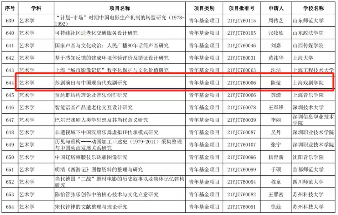 陈莹立项的课题是《莎剧演出与中国现当代戏剧研究》(青年基金项目) ,把1896年以来中国莎士比亚戏剧舞台演出的社会语境,以及改编、表演、导演、舞美、观众接受等作为研究对象,探讨莎剧演出与中国现当代戏剧发展的互动关系,尤其是莎剧演出对中国现当代戏剧自律性形成的意义;探究莎剧演出与中国文化的碰撞及其意义的转化、中国精神的表达,揭示丰富的中国现代性;总结莎剧演出成功与不足的深层原因,为当下戏剧生态建设、中国戏剧“走出去”提供理论依据和实践案例。